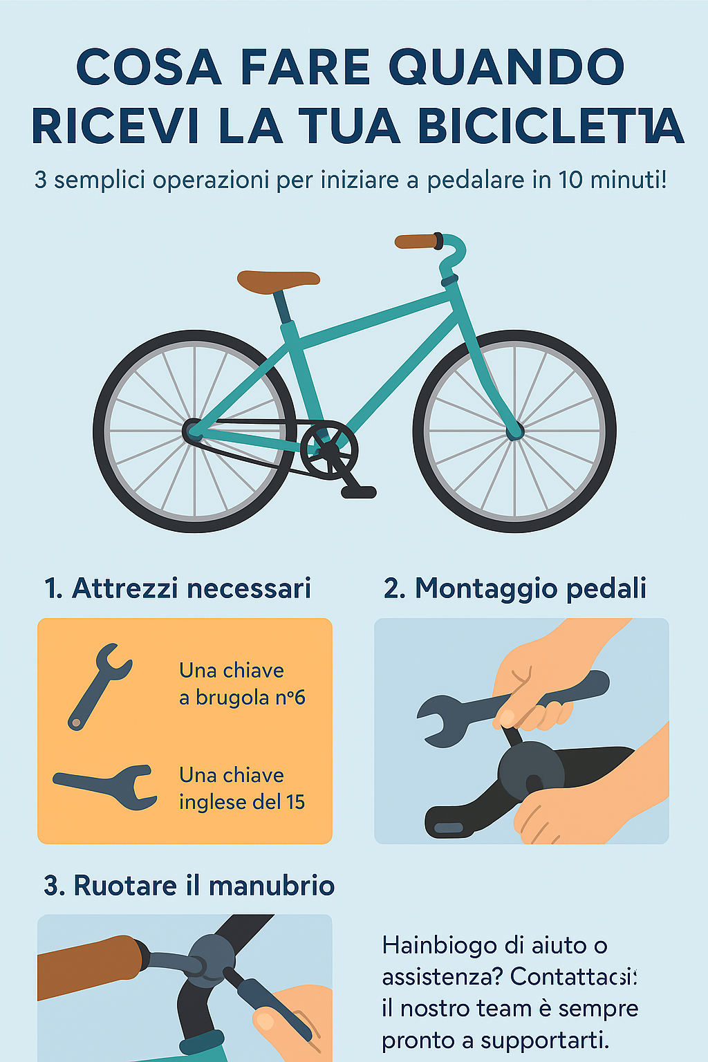 Per ottimizzare l’imballo, vengono rimossi i pedali e ruotato il manubrio. Queste saranno le uniche operazioni da eseguire una volta ricevuta la bici.