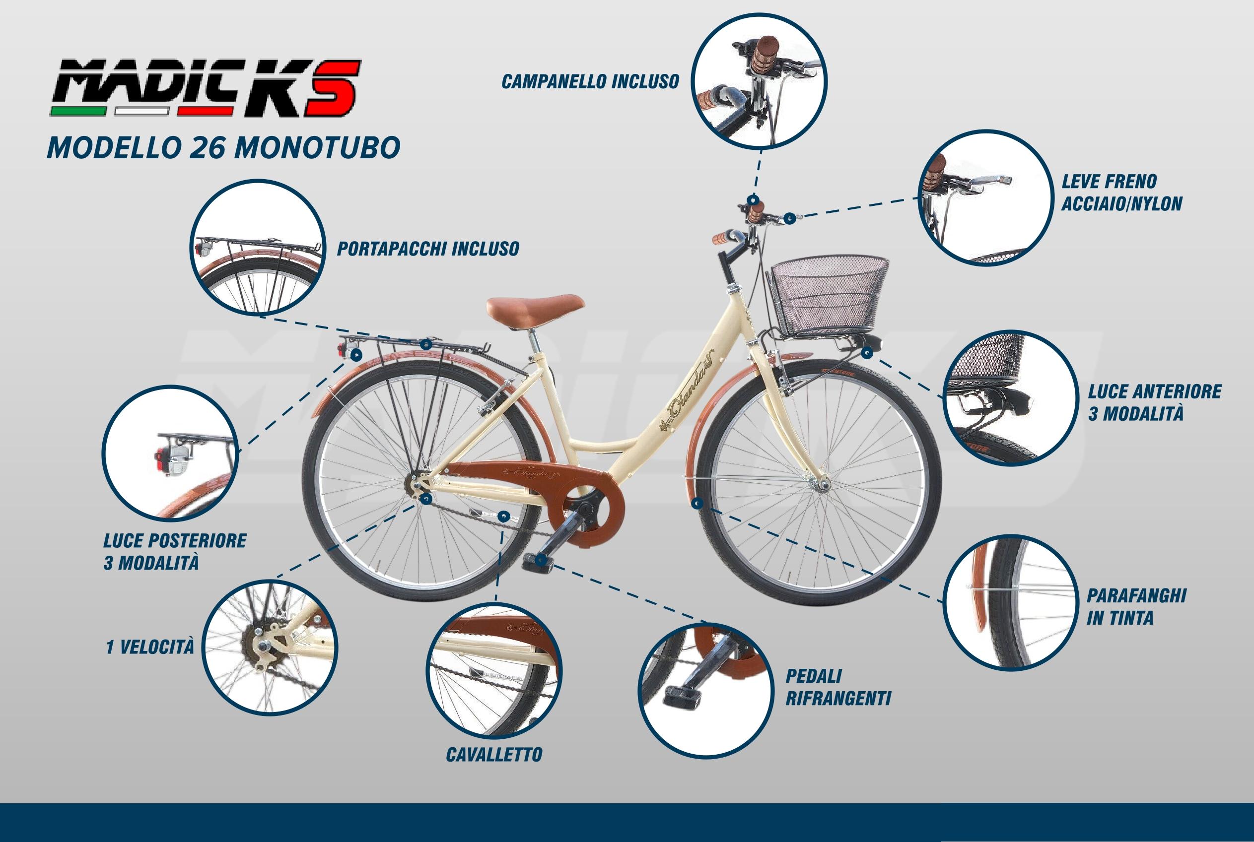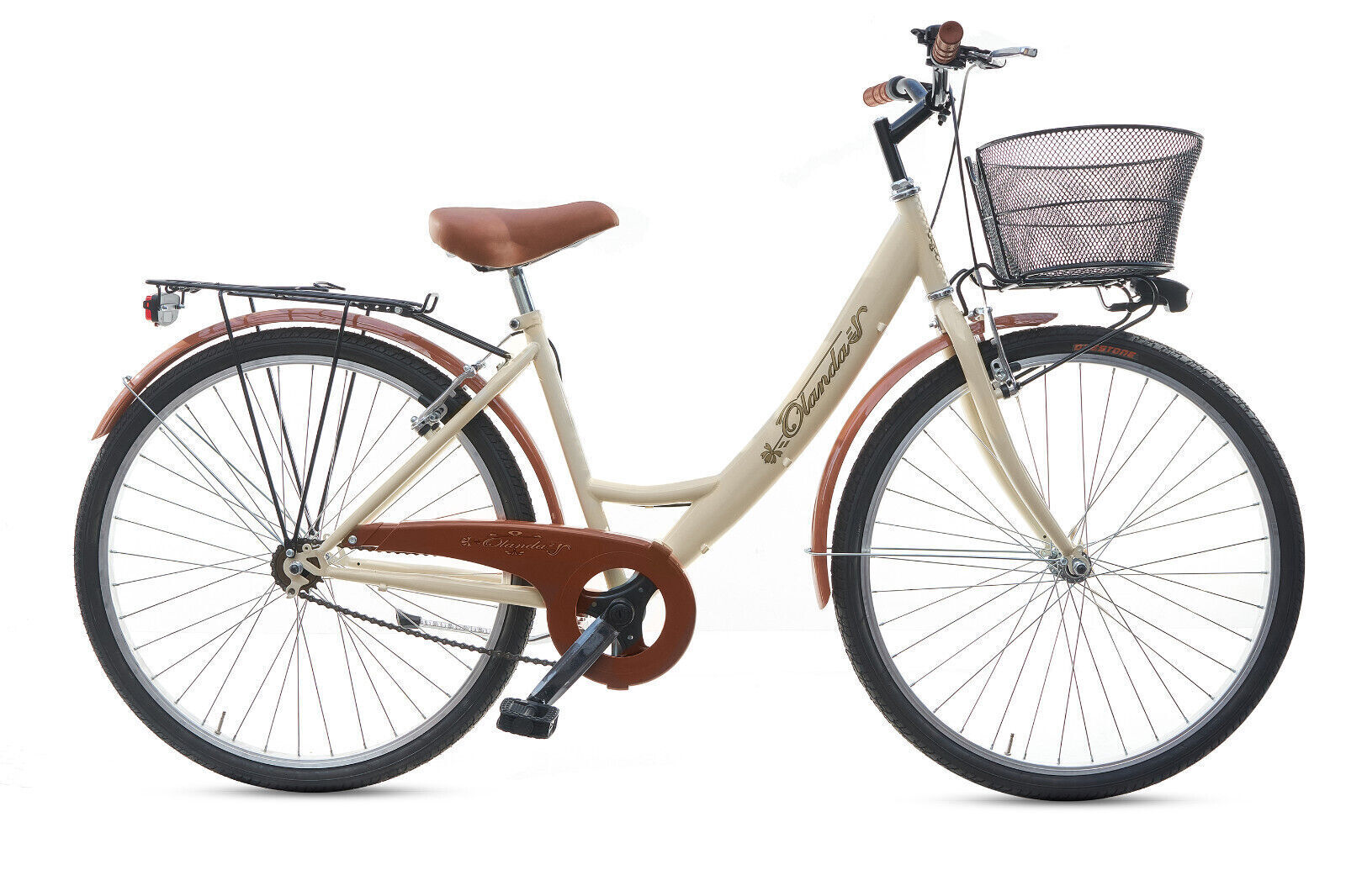 Bici da donna 26″ beige, struttura monotubo e cestino. Stile classico e massimo comfort in città.
