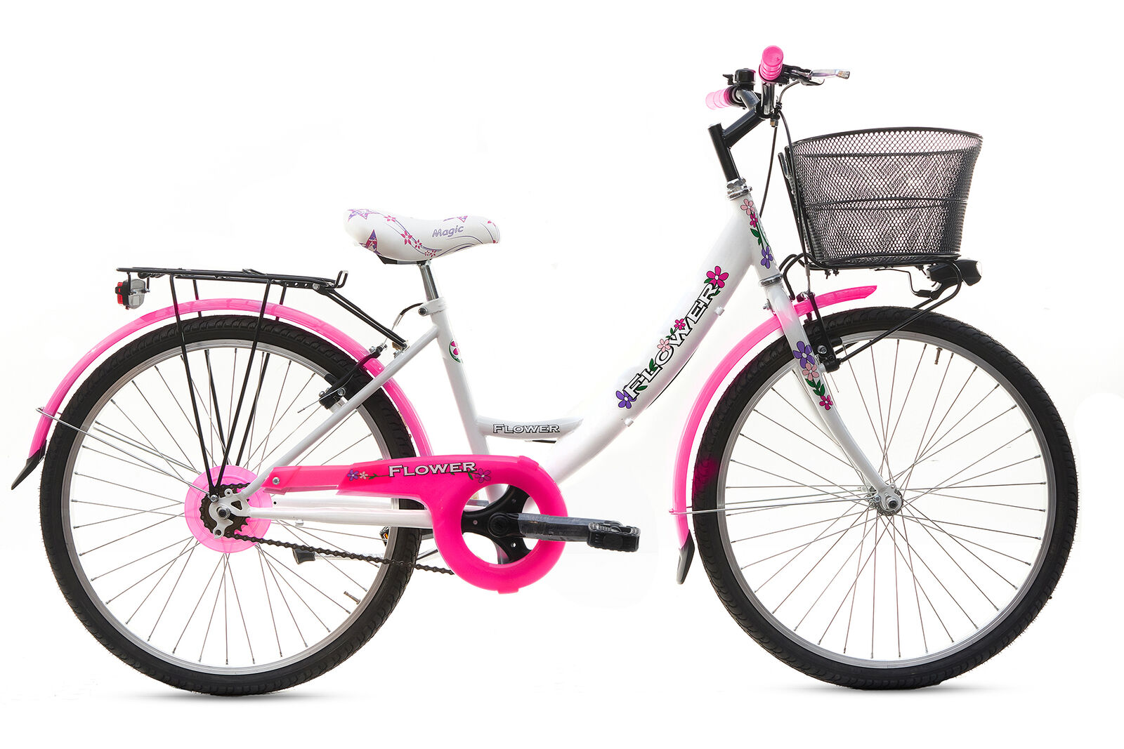 - Portapacchi posteriore, fanale anteriore e fanalino posteriore a LED, campanello, cavalletto e cestino inclusi