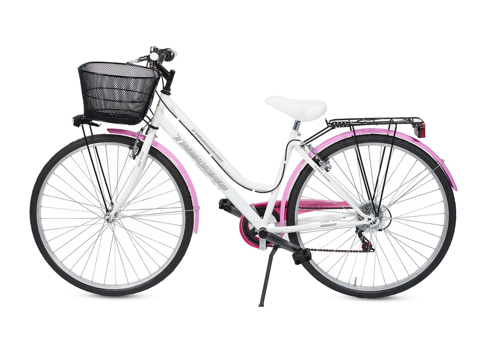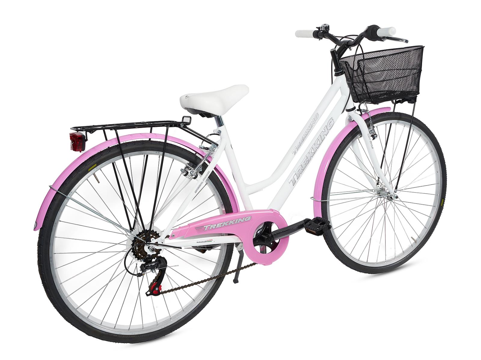 Bici da città 28″ bianca e rosa, cambio e cestino inclusi. Un mix di stile e praticità.