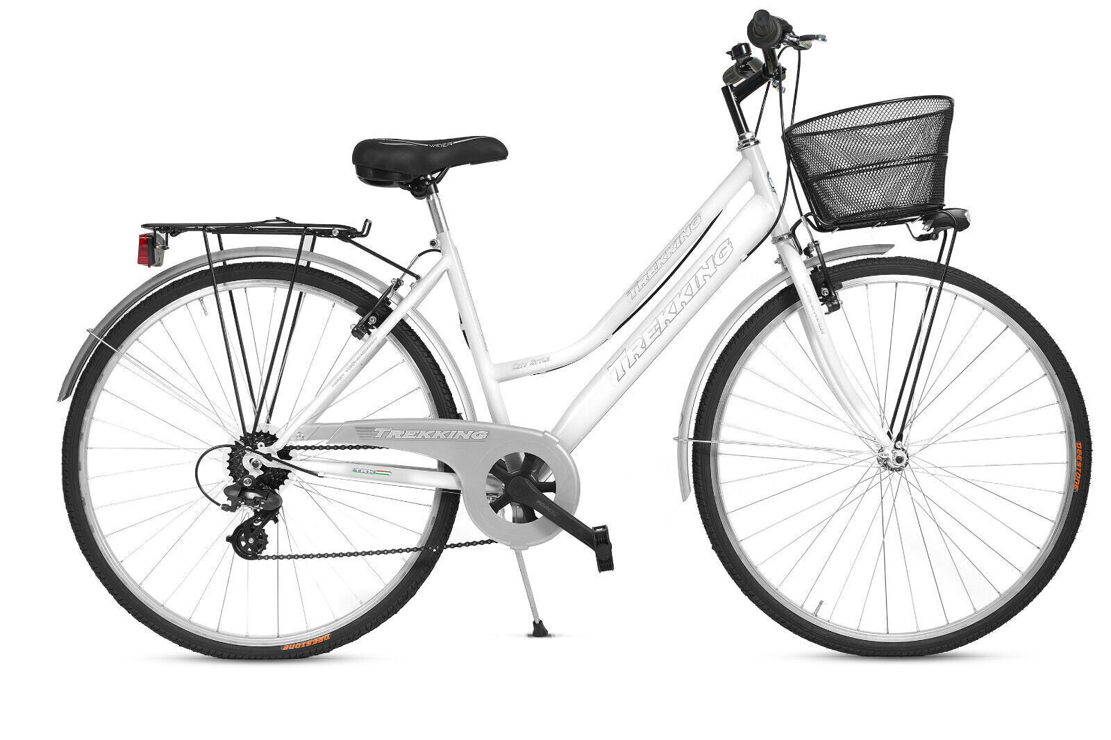 Bici da donna 28″ bianca con cambio e cestino, ideale per il massimo comfort nelle tue passeggiate.