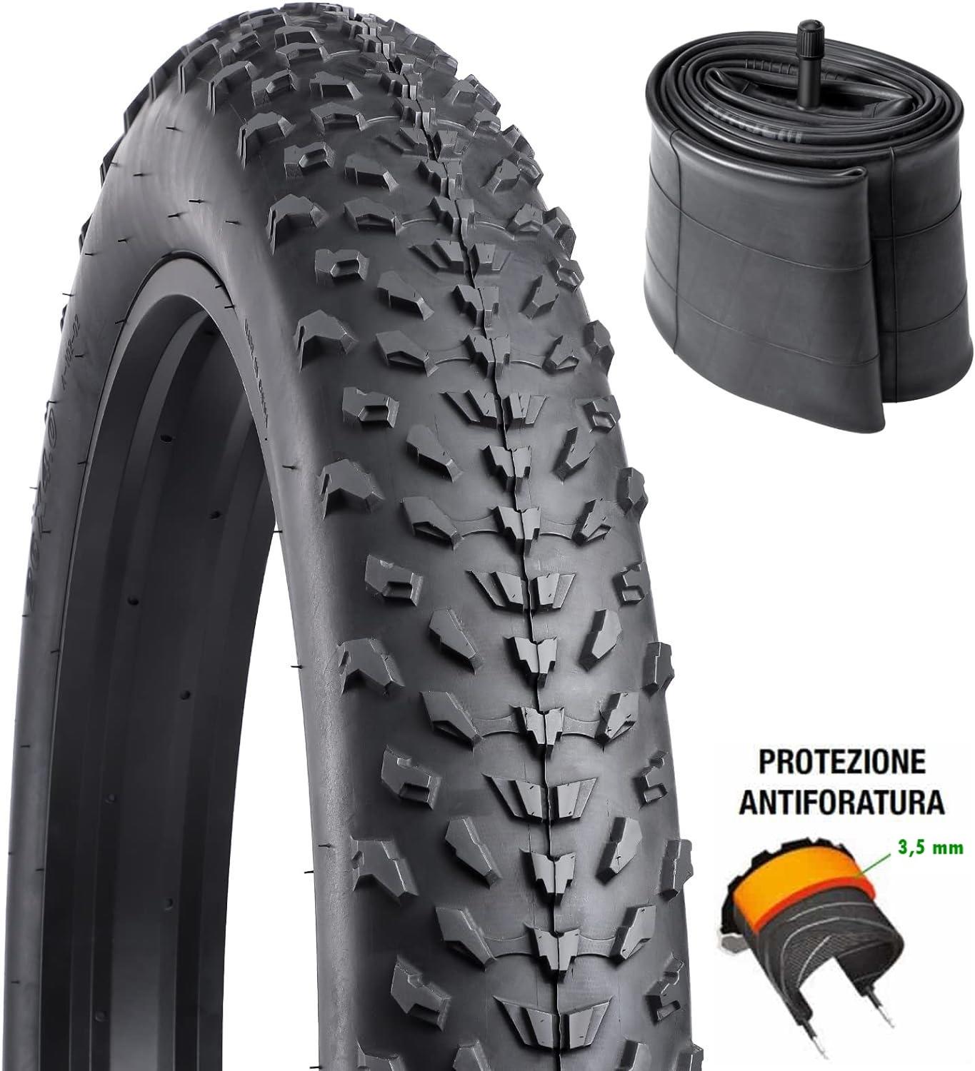 - Copertone Fat Bike con speciale strato antiforatura da 3,5 mm integrato sotto il battistrada. Offre una protezione avanzata contro forature e oggetti taglienti, ideale per affrontare terreni accidentati in tutta sicurezza. Pensato per chi cerca massima resistenza senza rinunciare a comfort e grip.