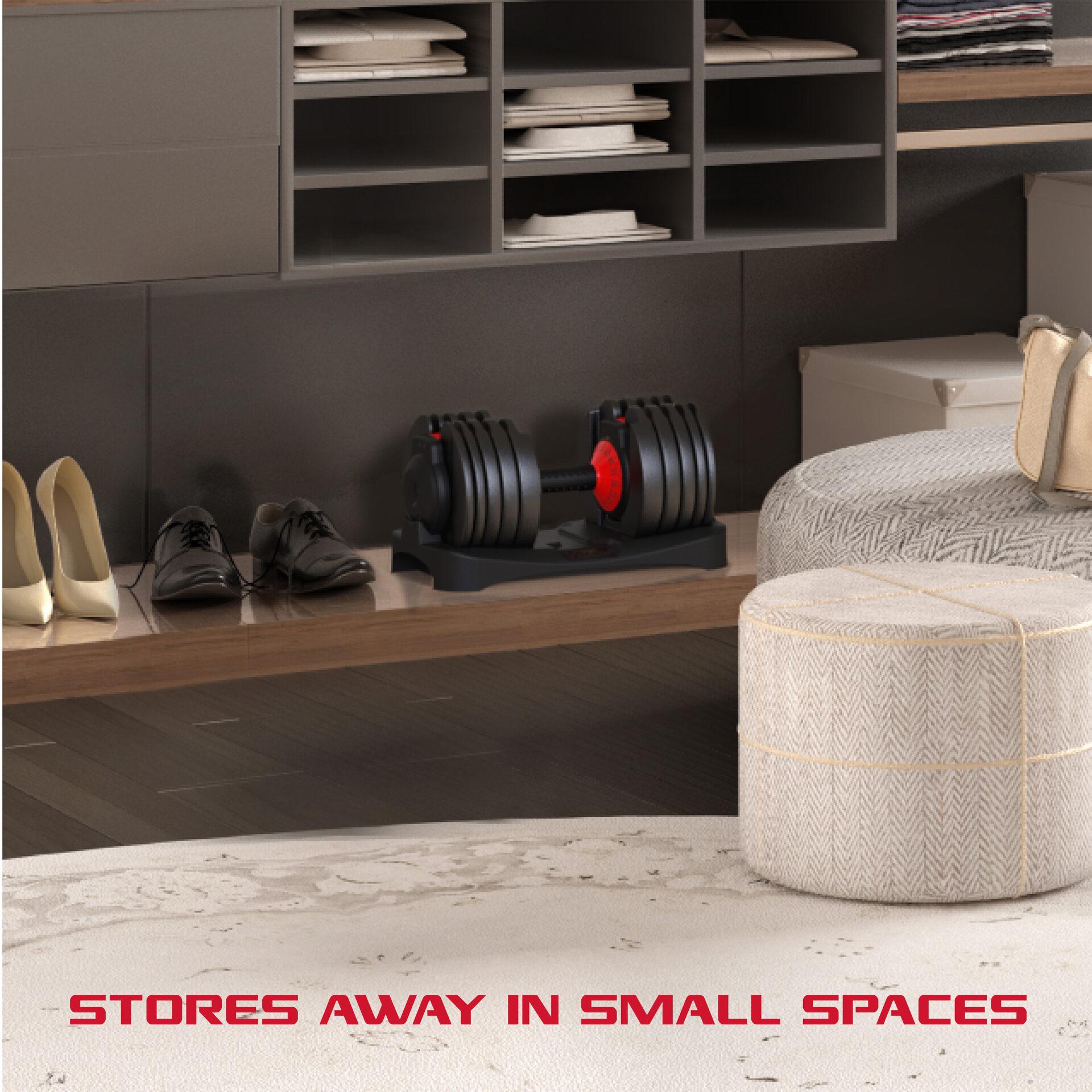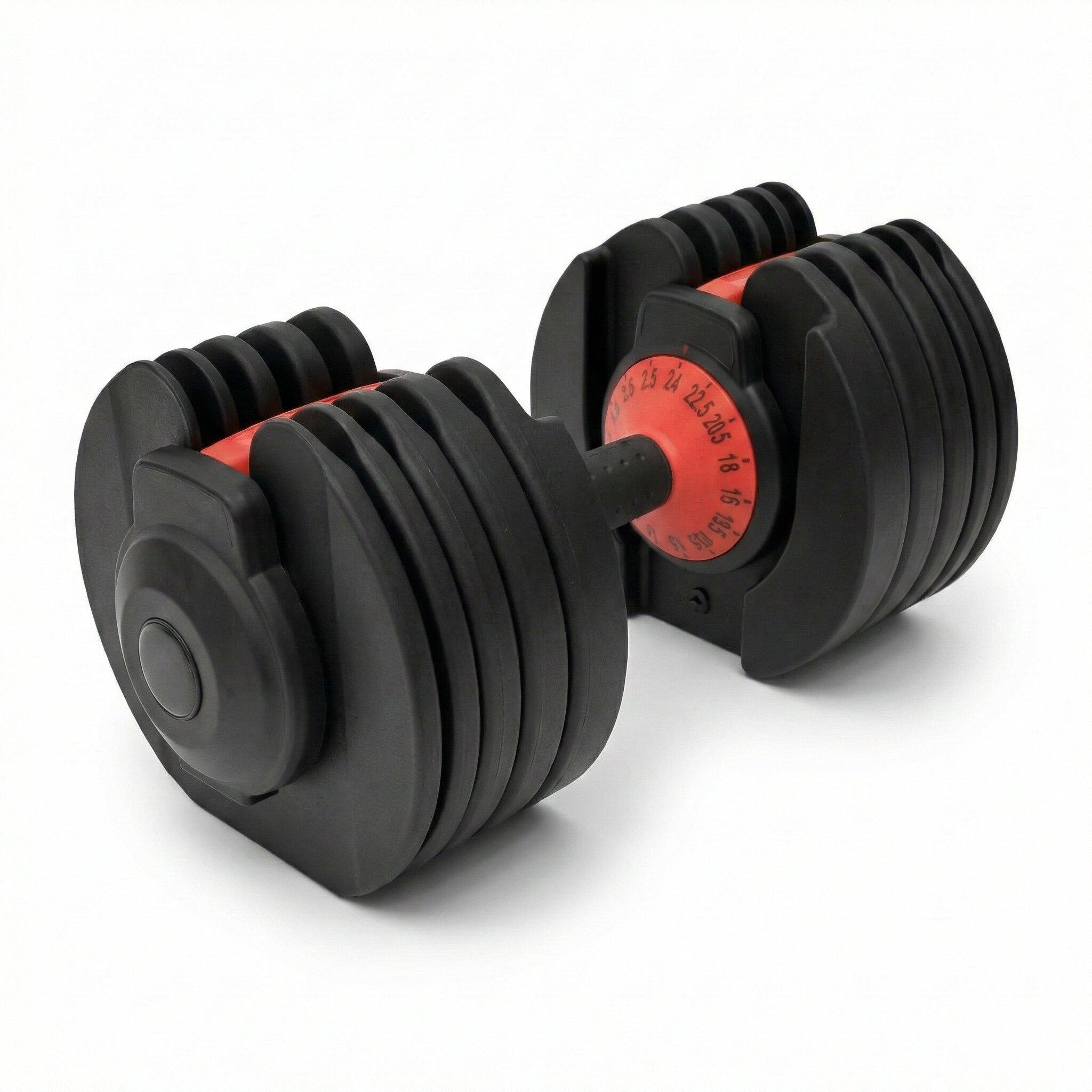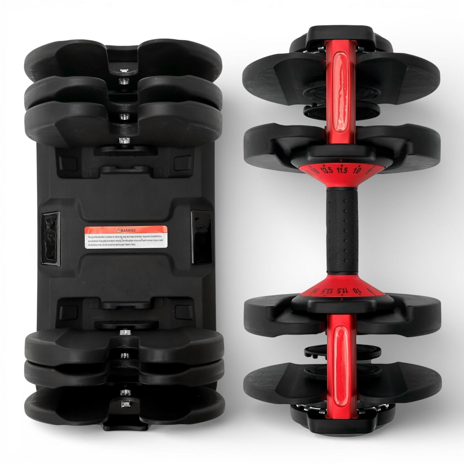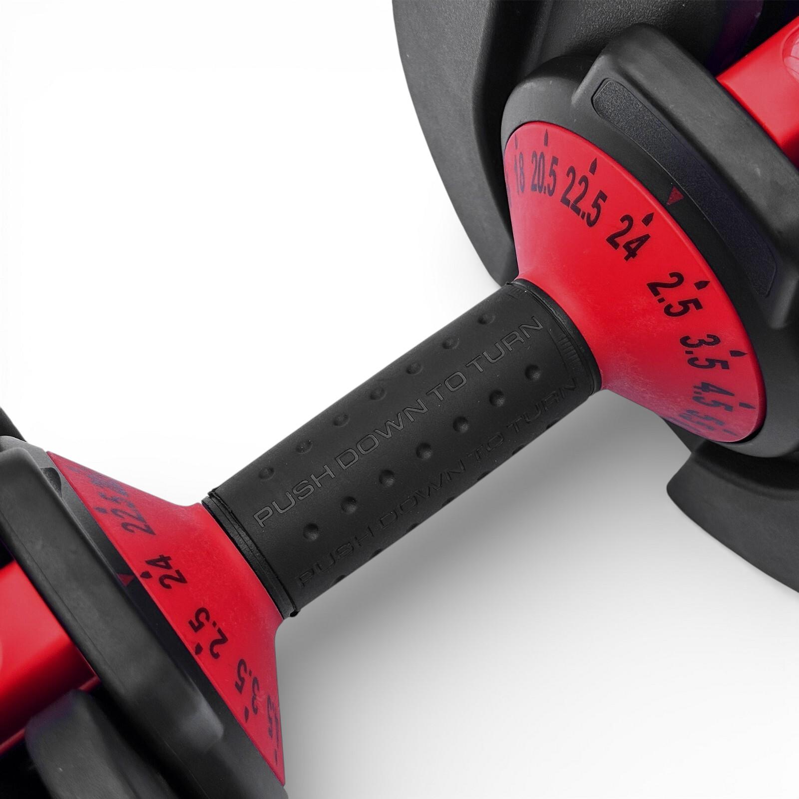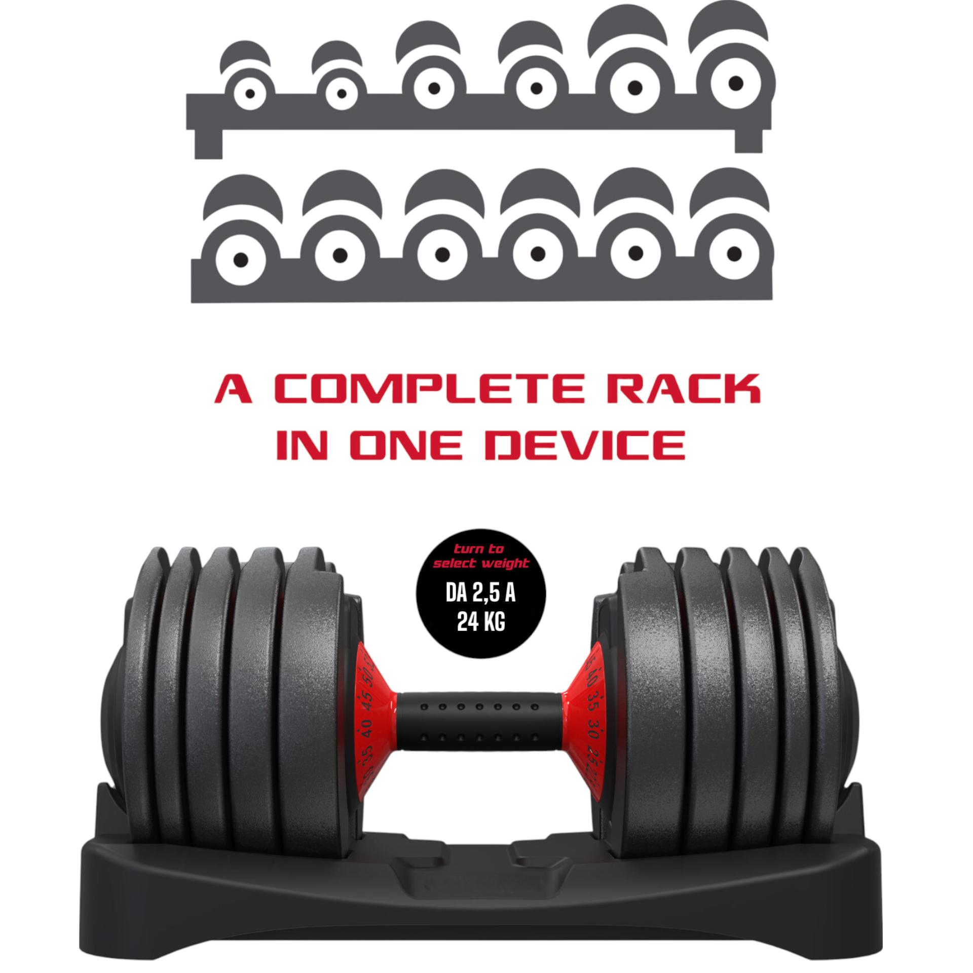 Manubrio regolabile da 2,5 a 24 kg con 15 livelli. Compatto e ideale per allenamenti in casa. Scopri il set con base V2, robusto e salvaspazio. Ordina ora!