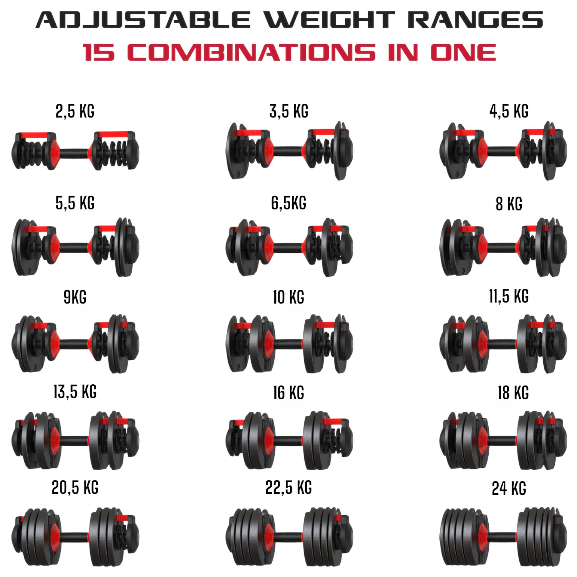 15 Livelli Di Peso Per Un Allenamento Personalizzato: Con pesi regolabili da 2. 5 a 24 kg, hai 15opzioni (2. 5, 3. 5, 4. 5, 5. 5, 6. 5, 8, 9, 10, 11. 5, 13. 5, 16, 18, 20. 5, 22. 5, 24 kg) per adattare ogni sessione alle tue esigenze, ideali per tonificazione, forza e resistenza.