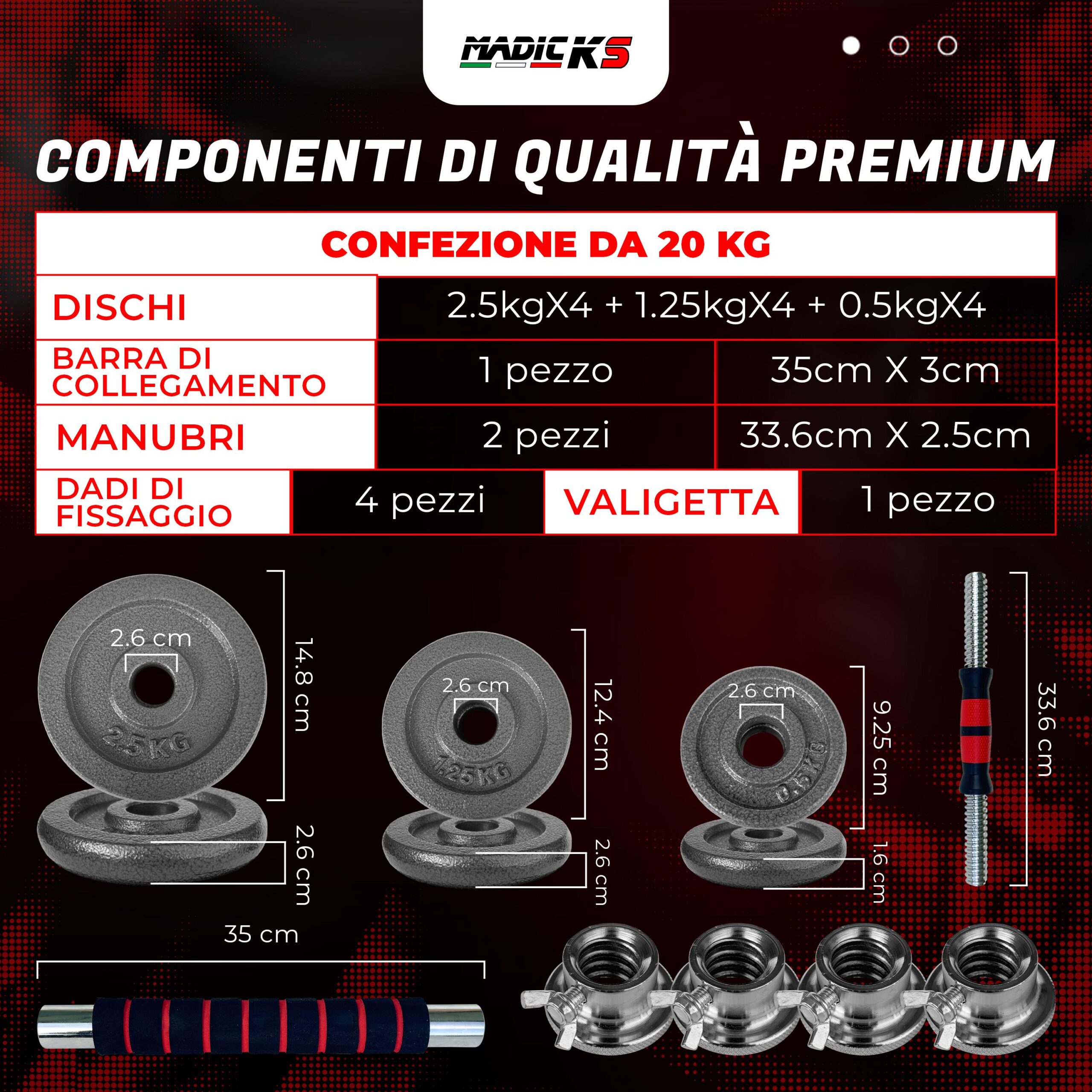 Scopri il nostro Set Manubri Pesi Palestra Kit Regolabili con Valigia e Bilanciere da 20 kg in Ghisa, perfetto per allenamenti versatili e completi. Questo kit include tutto ciò di cui hai bisogno per migliorare la tua forma fisica comodamente a casa o in palestra. Il set comprende 2 manubri da 34 cm, una pratica barra di collegamento da 30 cm che trasforma i manubri in un bilanciere, e 12dischi in ghisa (4 da 2, 5 kg, 4 da 1, 25 kg e 4 da 0, 5 kg), per adattare facilmente il peso al tuo livello di allenamento. Le impugnature ergonomiche antiscivolo sui manubri offrono una presa sicura, mentre la barra di collegamento è rivestita in morbida spugna per proteggere le mani e garantire comfort anche durante esercizi impegnativi come squat o pressioni sopra la testa. Tutto il set è contenuto in una valigetta nera compatta, perfetta per trasportare e conservare i pesi in modo ordinato e pratico. Questo design distintivo rende il nostro set una soluzione unica rispetto ai concorrenti, ideale per chi cerca qualità, praticità e versatilità. Inizia subito il tuo percorso fitness con un attrezzo resistente, funzionale e progettato per durare nel tempo!